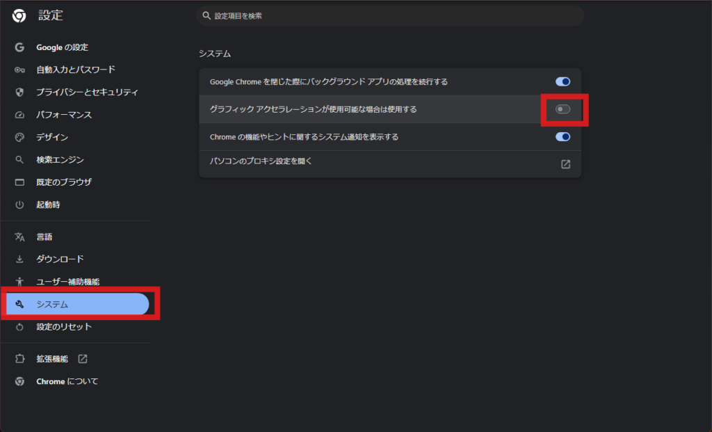 - 「ハードウェア アクセラレーションが使用可能な場合は使用する」をOFF